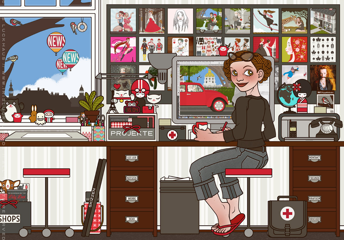Iris Luckhaus ist nicht nur für ihre Liebe zum Detail, sondern auch für ihre Illustrationen selbstbewusster Modemädchen bekannt, die sie neben Werbung z.B. auch für Bücher wie “Mein Leben mit Mitsu – Eine Geschichte von Liebe, Sehnsucht und Nudelsuppe” (Marcel Magis, Brandneu 2005)2, das Jugendbuch “Lillesang – Das Geheimnis der dunklen Nixe” (Nina Blazon, CBT 2014)3, den Ratgeber “Die Balkantherapie für Liebe, Leib und Leben” (Mimi Fiedler, MVG 2015)4 oder das Sachbuch “Du hast das Wort, Schätzchen! – 100 charmante Geschichten rund um die Sprache” (Rita Mielke, Duden 2017)5 gezeichnet hat.