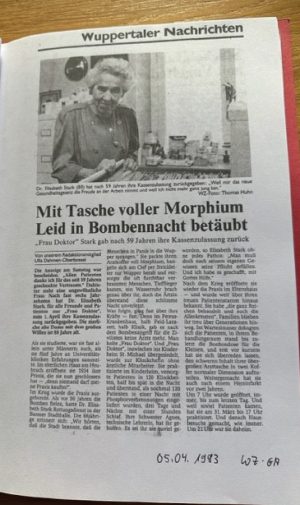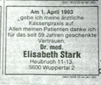 Frau Dr. med. Elisabeth Stark wurde am 04. Juli 1904 in Barmen (heute Wuppertal), Westkotter Str. 100, geboren. Sie starb am 14. April 1995 ebenfalls in Wuppertal. Ihre hausärztliche Praxis in Barmen, Heubruch 11-13, war eine Institution. Auch heute erinnern sich noch ehemalige Patient:innen sehr gut an sie und v.a. an ihre leidenschaftliche Art in der Versorgung ihrer Patient:innen.