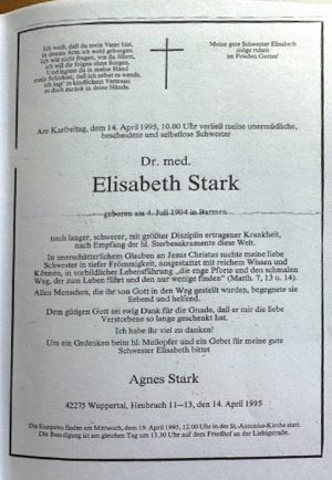 Elisabeth Stark arbeitete im 2. Weltkrieg auch in der Rettungsstelle und dort begann ihr ärztlicher Dienst abends um 20 Uhr, nach ihrer Praxistätigkeit. Bei dem furchtbaren Bombenangriff auf Barmen am 29./30. Mai 1943 kümmerte sie sich sehr tatkräftig um die Verletzten des Bombenangriffs und rettete vielen Menschen das Leben. In anschaulicher und eindrücklicher Weise hat sie diese Nacht dokumentiert (siehe ausführliches Tonmaterial unten)5. Nach 59 Jahren Tätigkeit als niedergelassene Hausärztin schloss sie am 01. April 1993 ihre Praxis.6 Sie hat sich ihr Leben lang ihrer ärztlichen Tätigkeit, der Familie und ihrem katholischen Glauben verschrieben. Es gibt heute noch Menschen, deren Hausärztin sie war und die immer noch voller Respekt und Zuneigung an sie denken und von ihr sprechen. Im Urlaub in Arosa in der Ferienwohnung ihrer Schwester Agnes erlitt Elisabeth Stark einen Schlaganfall/Herzinfarkt. Von den Erkrankungen erholte sie sich nicht wirklich. Ihre Schwester holte sie zurück nach Wuppertal, wo sie am 14. April 1995 starb.7
